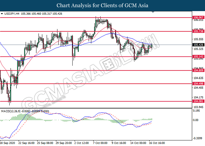 USDJPY, H4: USDJPY was traded higher following prior rebound from the support level at 105.15. MACD which illustrate bullish bias momentum suggest the pair to extend its gains toward the resistance level at 105.75.