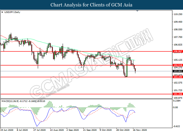 USDJPY, Daily: USDJPY was traded lower following prior breakout below the previous support level at 104.50. MACD which illustrated diminishing bullish momentum suggest the pair to extend its losses toward support level at 103.20.