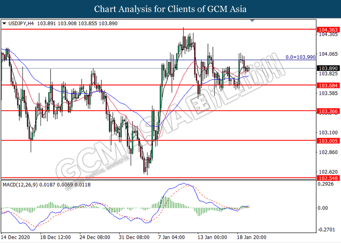 USDJPY, H4: USDJPY was traded lower following prior retracement from the resistance level at 104.00. MACD which illustrated diminishing bullish momentum suggest the pair to extend its losses toward the lower level.