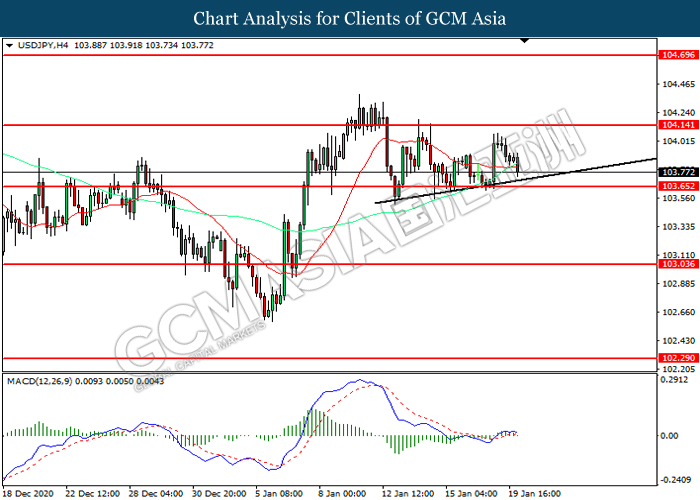 USDJPY, H4: USDJPY was traded lower while currently near the support level at 103.65. MACD which illustrated diminishing bullish momentum suggest the pair to extend its losses after it successfully breakout below the support level.