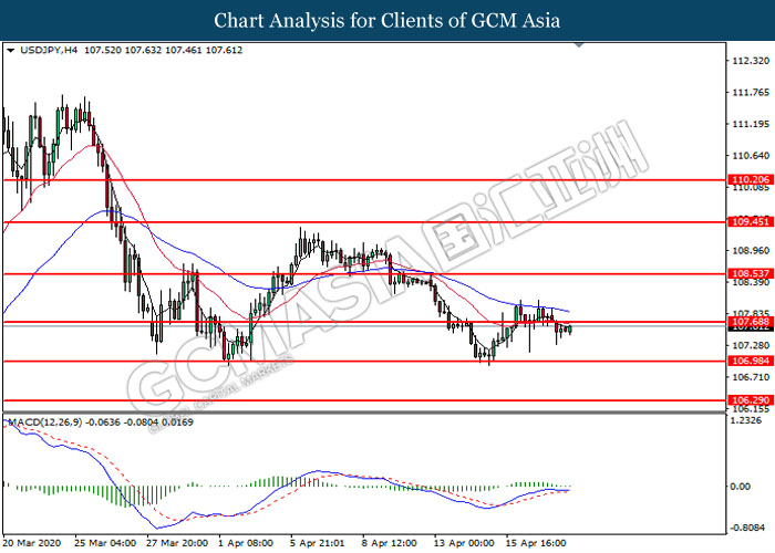 USDJPY, H4: USDJPY was traded lower following prior breakout below the previous support level at 107.70. MACD which illustrate diminishing bullish momentum signal suggests the pair to extend its losses toward the support level at 107.00.