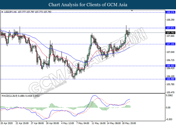 USDJPY, H4: USDJPY was traded higher while currently testing near the resistance level 107.95. However, MACD which illustrate diminishing bullish momentum signal suggest the pair to be traded lower as a technical correction towards the support level 107.35.