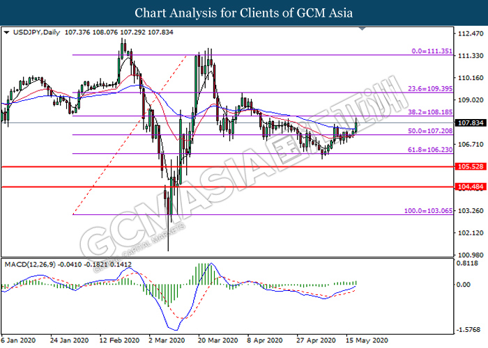 USDJPY, Daily: USDJPY was traded higher following prior breakout above the previous resistance level at 107.20. MACD which illustrate bullish bias momentum signal suggest the pair to extend its gains toward the resistance level at 108.20.