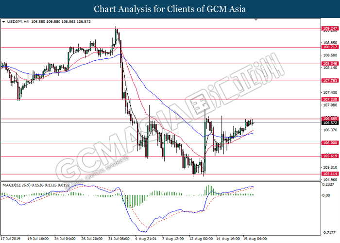 USDJPY, H4: USDJPY was traded higher while currently testing near the resistance level 106.70. However, MACD which display diminishing bullish momentum suggest the pair to undergo short-term technical correction and retrace towards the support level 106.00.