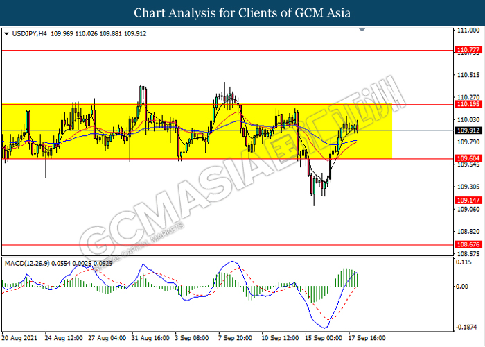 USDJPY, H4: USDJPY remain traded in a sideway channel. However, MACD which illustrate diminishing bullish momentum signal suggest the pair to be traded lower in short term towards the support level.