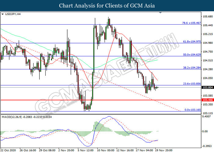 USDJPY, H4: USDJPY was traded within a range while currently testing the resistance level at 103.85. MACD which illustrated increasing bullish momentum suggest the pair to be traded higher after it successfully breakout above the resistance level.