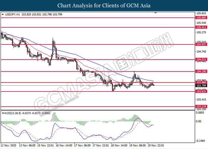 USDJPY, H1: USDJPY was traded lower following prior retracement from the resistance level at 103.90. MACD which illustrate bearish signal suggest the pair to extend its losses toward the support level at 103.65.