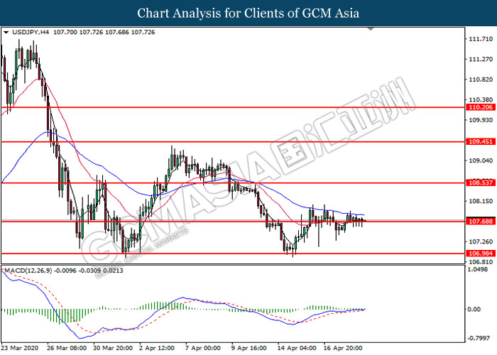USDJPY, H4: USDJPY was traded lower while currently testing the support level at 107.70. However, MACD which illustrate bullish bias momentum signal suggests the pair to undergo technical rebound from the support level.