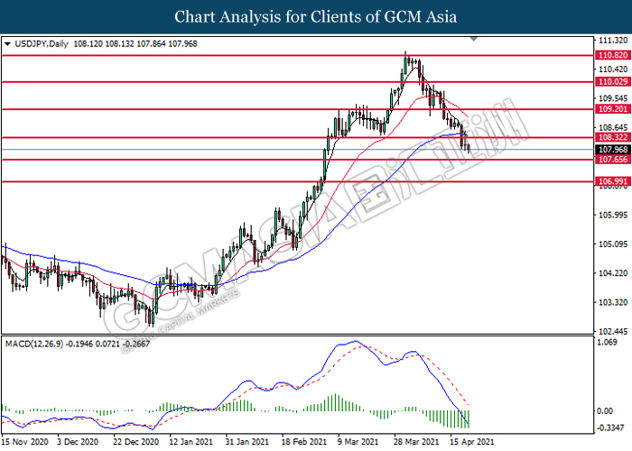 USDJPY, Daily: USDJPY was traded lower following prior breakout below the previous support level at 108.30. MACD which illustrated bearish bias momentum signal suggest the pair to extend its losses toward the support level at 107.65.
