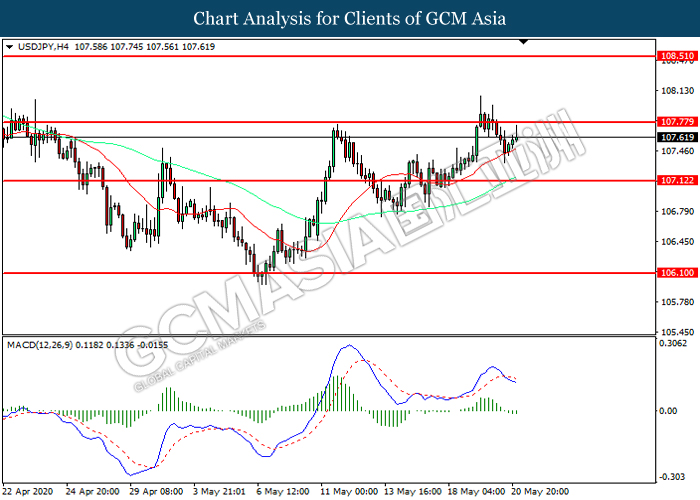 USDJPY, H4: USDJPY was traded lower following prior retracement from the resistance level at 107.80. MACD which illustrated increasing bearish momentum suggest the pair to extend its losses toward support level at 107.10.