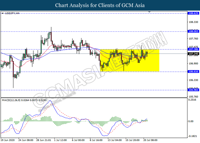 USDJPY, H4: USDJPY remain traded in a sideway channel near the resistance level 107.40. However, MACD which illustrate bullish momentum signal suggest the pair to be traded higher after it breaks above the resistance level.