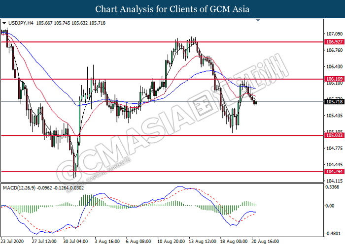 USDJPY, H4: USDJPY was traded lower following prior retracement from the resistance level at 106.15. MACD which display diminishing bullish momentum suggest the pair to extend its losses toward the support level at 105.05.