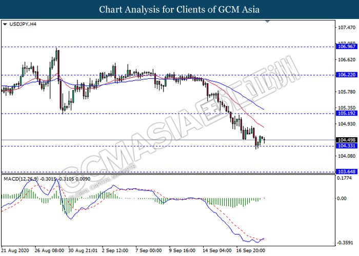 USDJPY, H4: USDJPY was traded lower while currently testing near the support level 104.35. However, MACD which illustrate bullish momentum signal with the formation of golden cross suggest the pair to experience a technical correction towards the resistance level 105.20.