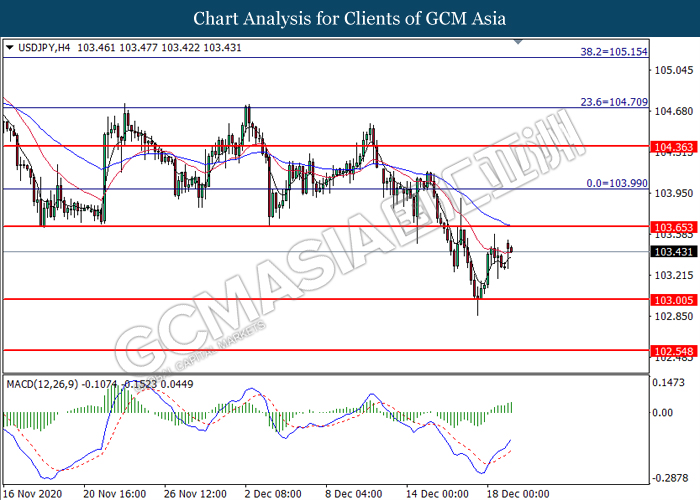 USDJPY, H4: USDJPY was traded higher following prior rebound from the support level at 103.00. MACD which illustrated bullish bias momentum suggest the pair to be traded higher toward the resistance level at 103.65.