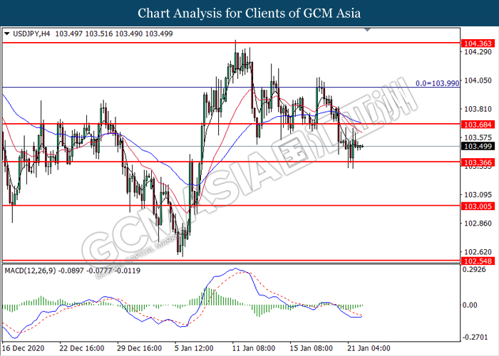 USDJPY, H4: USDJPY was traded higher following prior rebound from the support level at 103.35. MACD which illustrated diminishing bearish momentum suggest the pair to extend its gains toward the resistance level at 103.70.