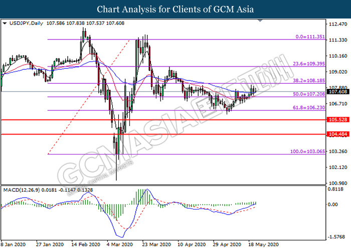 USDJPY, Daily: USDJPY was traded higher following prior breakout above the previous resistance level at 107.20. MACD which illustrate bullish bias momentum signal suggest the pair to extend its gains toward the resistance level at 108.20.