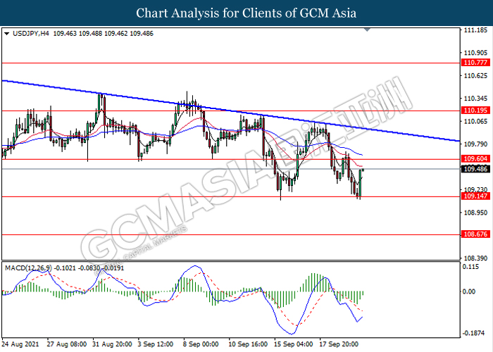 USDJPY, H4: USDJPY was traded higher while currently testing near the resistance level 109.60. MACD which illustrate diminishing bearish momentum signal suggest the pair to extend its gains after it breaks above the resistance level 109.60.