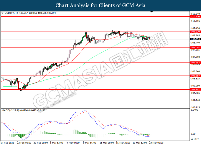 USDJPY, H4: USDJPY was traded lower following prior retracement from the resistance level at 109.20. However, MACD which illustrated diminishing bearish momentum suggest the pair to be traded higher in short-term as technical correction.