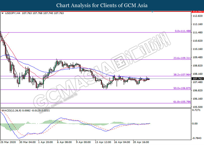 USDJPY, H4: USDJPY was traded flat below the resistance level at 107.95. Due to lack of signal from MACD, it is suggested to wait for further confirmation before entering into the market.