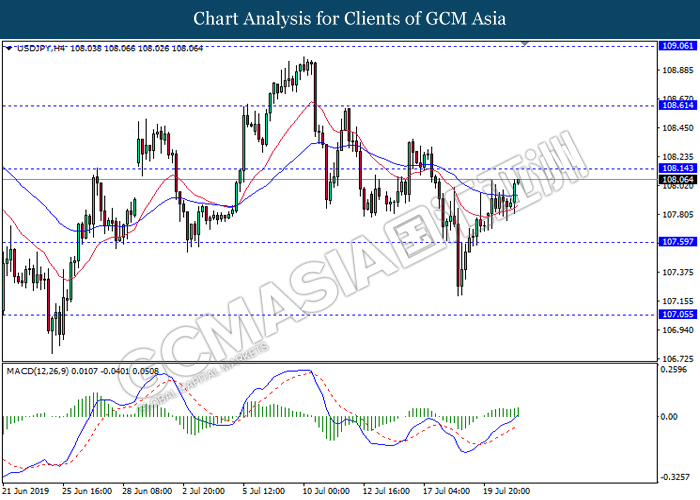 USDJPY, H4: USDJPY was traded higher while currently testing near resistance level 108.15. MACD which illustrate persistent bullish momentum suggest the pair to extend its gains after it breaks above the resistance level.