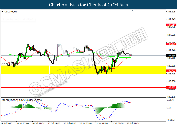 USDJPY, H1: USDJPY was traded higher following prior rebound from the support level at 106.75. However, MACD which illustrated increasing bearish momentum suggest the pair to be traded lower in short-term as technical correction.