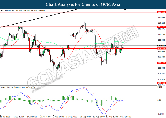 USDJPY, H4: USDJPY was traded higher following prior breakout above the previous resistance level at 109.75. However, MACD which illustrated diminishing bullish momentum suggest the pair to be traded lower in short-term as technical correction.