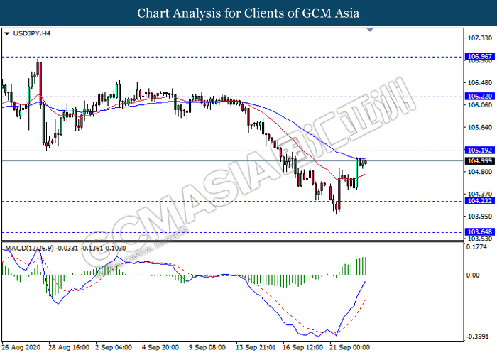 USDJPY, H4: USDJPY was traded higher while currently testing near the resistance level 105.20. MACD which display ongoing bullish momentum suggest the pair to extend its gains after it breaks above the resistance level.