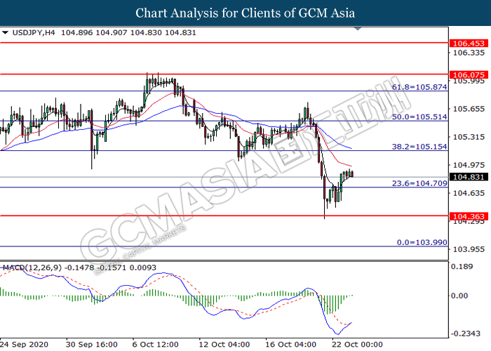 USDJPY, H4: USDJPY was traded higher following prior breakout above the previous resistance level at 104.70. MACD which illustrate diminishing bearish momentum suggest the pair to extend its gains toward the resistance level at 105.15.