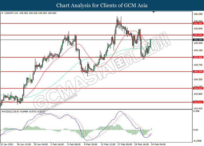 USDJPY, H4: USDJPY was traded higher following prior rebound from the support level at 104.95. MACD which illustrated increasing bullish momentum suggest the pair to extend its gains toward resistance level at 105.65.