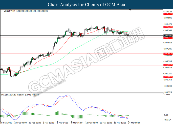 USDJPY, H4: USDJPY was traded lower while currently testing the support level at 108.30. MACD which illustrated increasing bearish momentum suggest the pair to extend its losses after it successfully breakout below the support level.