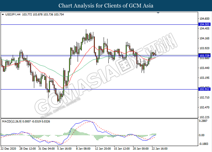 USDJPY, H4: USDJPY was traded higher following recent breakout above the previous resistance level 103.70. MACD which illustrate ongoing bullish momentum signal suggest the pair to extend its gains towards the resistance level 104.50.