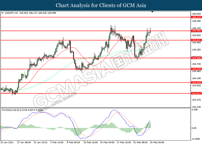 USDJPY, H4: USDJPY was traded higher while currently testing the resistance level at 106.00. MACD which illustrated increasing bullish momentum suggest the pair to extend its gains after it successfully breakout above the resistance level.