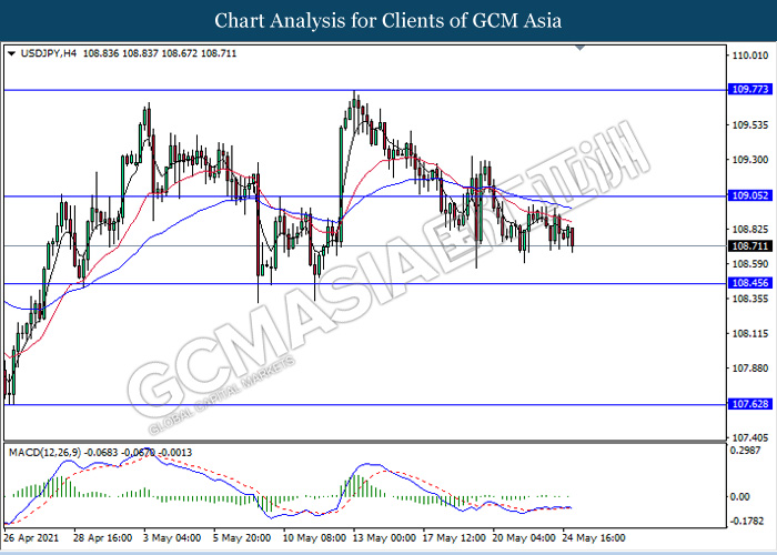 USDJPY, H4: USDJPY was traded lower following prior retracement from its high level. MACD which illustrate bearish bias signal suggest the pair to extend its losses in short term towards the support level 108.45.