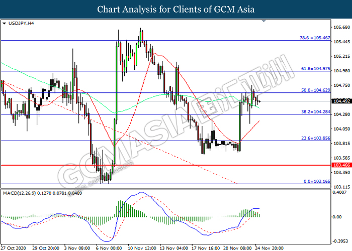 USDJPY, H4: USDJPY was traded lower following prior retracement from the resistance level at 104.65. MACD which illustrated diminishing bullish momentum suggest the pair to extend its losses toward support level at 104.30.