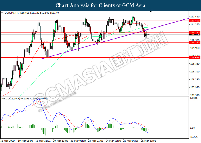 USDJPY, H1: USDJPY was traded lower following prior breakout below the previous support level at 110.80. However, MACD which illustrated diminishing bearish momentum suggest the pair to be traded higher in short-term as technical correction.