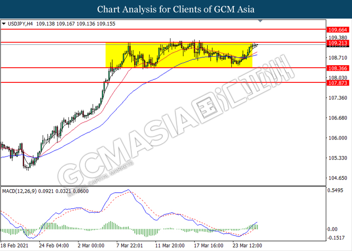 USDJPY, H4: USDJPY was traded higher while currently testing the top level of sideway channel. MACD which illustrated bullish bias momentum signal suggest the pair to extend its gains after it successfully breakout above the resistance level.