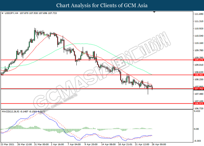 USDJPY, H4: USDJPY was traded lower while currently testing the support level at 107.75. MACD which illustrated diminishing bullish momentum suggest the pair to extend its losses after it successfully breakout below the support level.