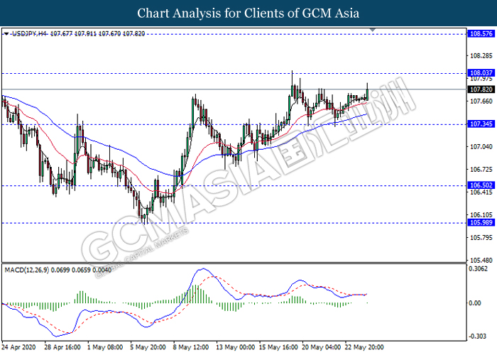 USDJPY, H4: USDJPY was traded higher following recent rebound from the support level 107.35. MACD which illustrate diminishing bearish bias signal with the formation of golden cross suggest the pair to extend its gains in short term towards the resistance level 108.05.