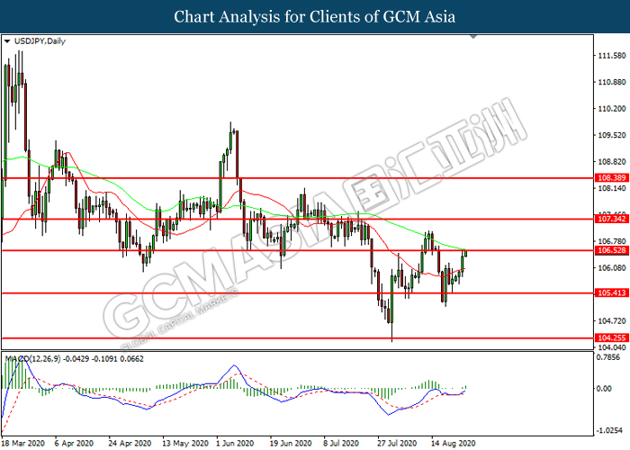 USDJPY, Daily: USDJPY was traded higher while currently testing the resistance level at 106.55. MACD which illustrated increasing bullish momentum suggest the pair to extend its gains after it successfully breakout above the resistance level.
