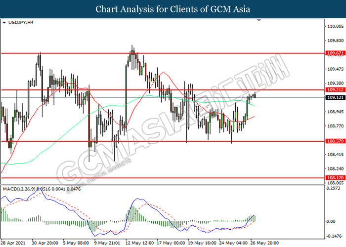 USDJPY, H4: USDJPY was traded higher while currently testing the resistance level at 109.20. MACD which illustrated increasing bullish momentum suggest the pair to extend its gains after it successfully breakout above the resistance level.