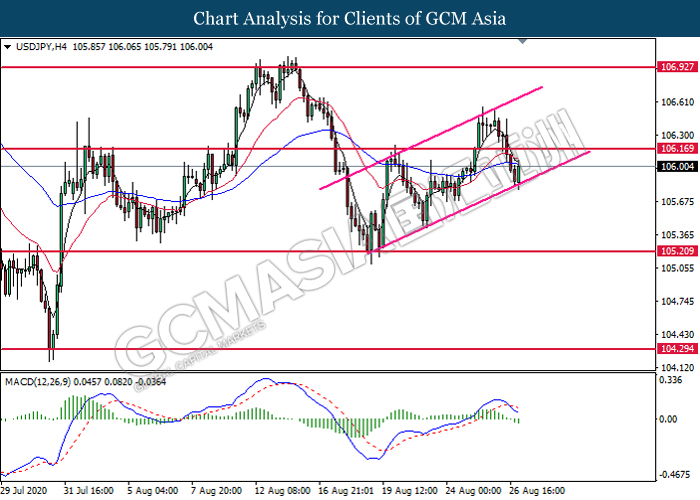 USDJPY, H4: USDJPY was traded higher following prior rebound from the bottom level of upward channel. However, MACD which display bearish bias momentum suggest the pair to undergo technical correction in short term toward lower level.