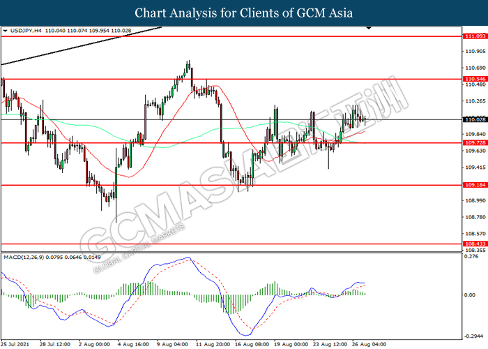 USDJPY, H4: USDJPY was traded higher following prior rebound from the support level at 109.75. However, MACD which illustrated diminishing bullish momentum suggest the pair to be traded lower in short-term as technical correction.