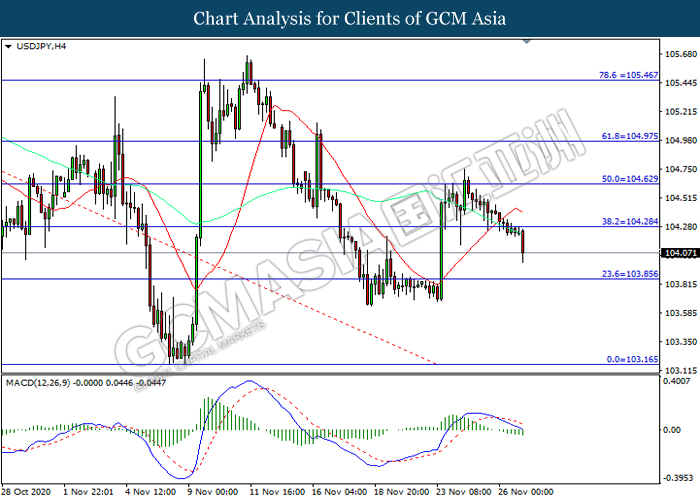 USDJPY, H4: USDJPY was traded lower following prior breakout below the previous support level at 104.30. MACD which illustrated increasing bearish momentum suggest the pair to extend its losses toward support level at 103.85.