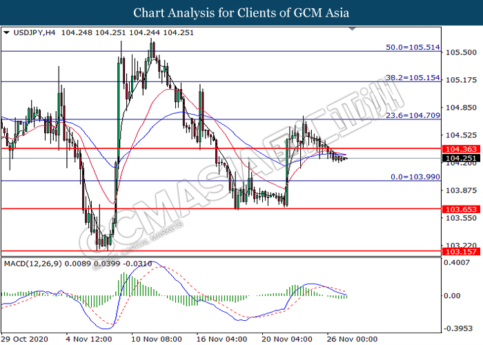 USDJPY, H4: USDJPY was traded lower following prior breakout below the previous support level at 104.35. MACD which illustrate bearish bias momentum suggest the pair to extend its losses toward the support level at 104.00.