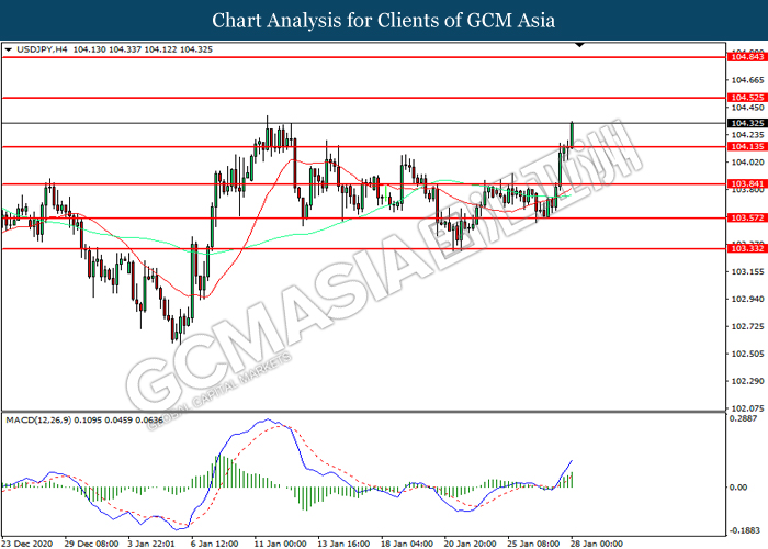 USDJPY, H4: USDJPY was traded higher following prior breakout above the previous resistance level at 104.35. MACD which illustrated increasing bullish momentum suggest the pair to extend its gains toward resistance level at 104.55.