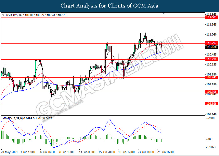 USDJPY, H4: USDJPY was traded lower following prior retracement from the resistance level 110.80. MACD which illustrate bearish momentum signal suggest the pair to extend its losses towards the support level 110.30.
