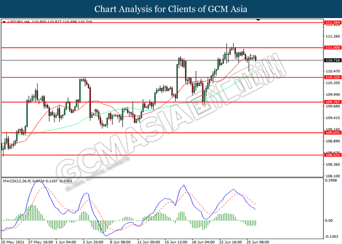USDJPY, H4: USDJPY was traded lower following prior retracement from the resistance level at 111.00. MACD which illustrated increasing bearish momentum suggest the pair to extend its losses toward support level at 110.35.