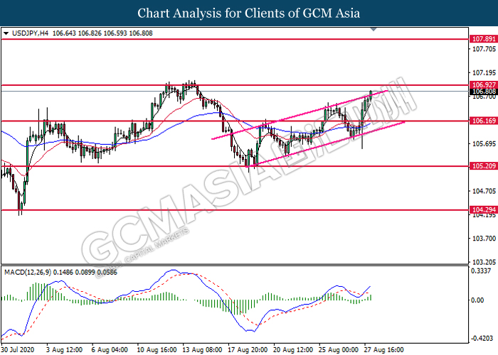 USDJPY, H4: USDJPY was traded higher while currently testing the top level of upward channel. MACD which display bullish bias momentum suggest the pair to extend its gains after it successfully breakout above the upward channel.