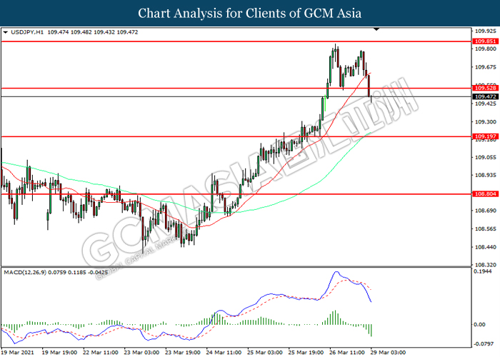 USDJPY, H1: USDJPY was traded lower following prior breakout below the previous support level at 109.55. MACD which illustrated increasing bearish momentum suggest the pair to extend its losses toward support level at 109.20.
