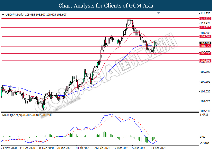 USDJPY, Daily: USDJPY was traded higher following prior breakout above the previous resistance level at 108.30. MACD which illustrated diminishing bearish momentum signal suggest the pair to extend its gains toward the resistance level at 109.20.